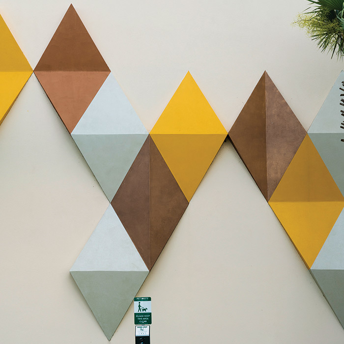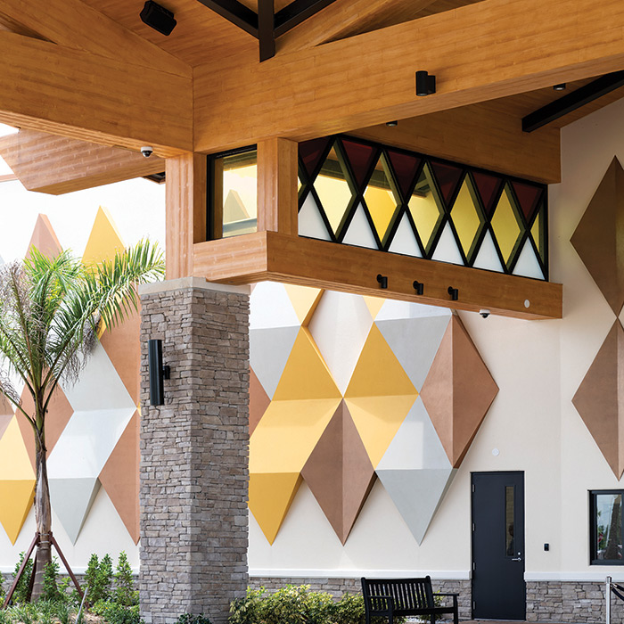 As a final touch to the design, the architect wanted to integrate 3-D diamonds over the StoTherm ci finish. Referencing a central motif in the Tribe’s logo, 9,000 square feet of the foam-cut diamonds were finished in Keweenaw Bronze, Bavarian Wheat, and Valencia Orange, with StoColor Metallic added for a reflective, vibrant finish.